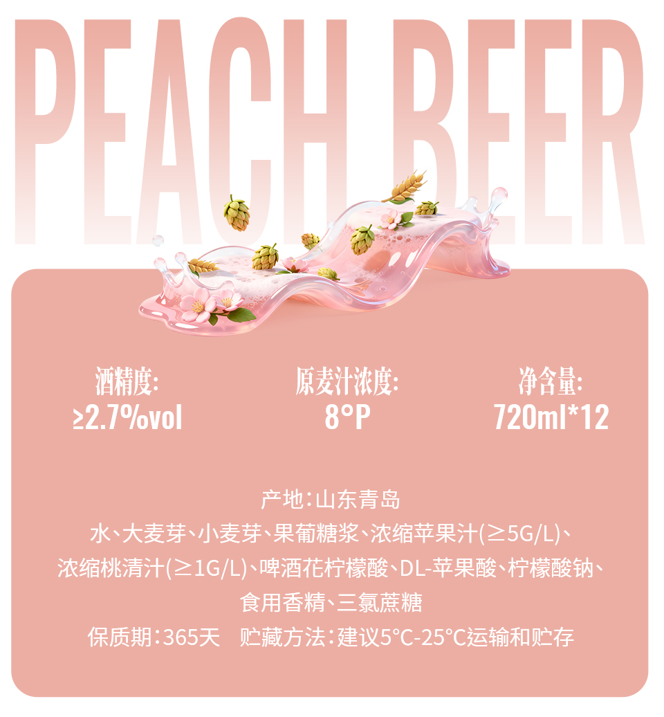 产地:山东青岛 原料与辅料:水、大麦芽、小麦芽、果葡糖浆、浓缩苹果汁(≥5g/L)、浓缩桃清汁(≥1g/L)、啤酒花、柠檬酸、DL-苹果酸、柠檬酸钠、食用香精、三氯蔗糖、 酒精度:≥2.7%vol 原麦汁浓度:8°P 保质期:12个月 贮藏方法:建议5℃-25℃运输和贮存