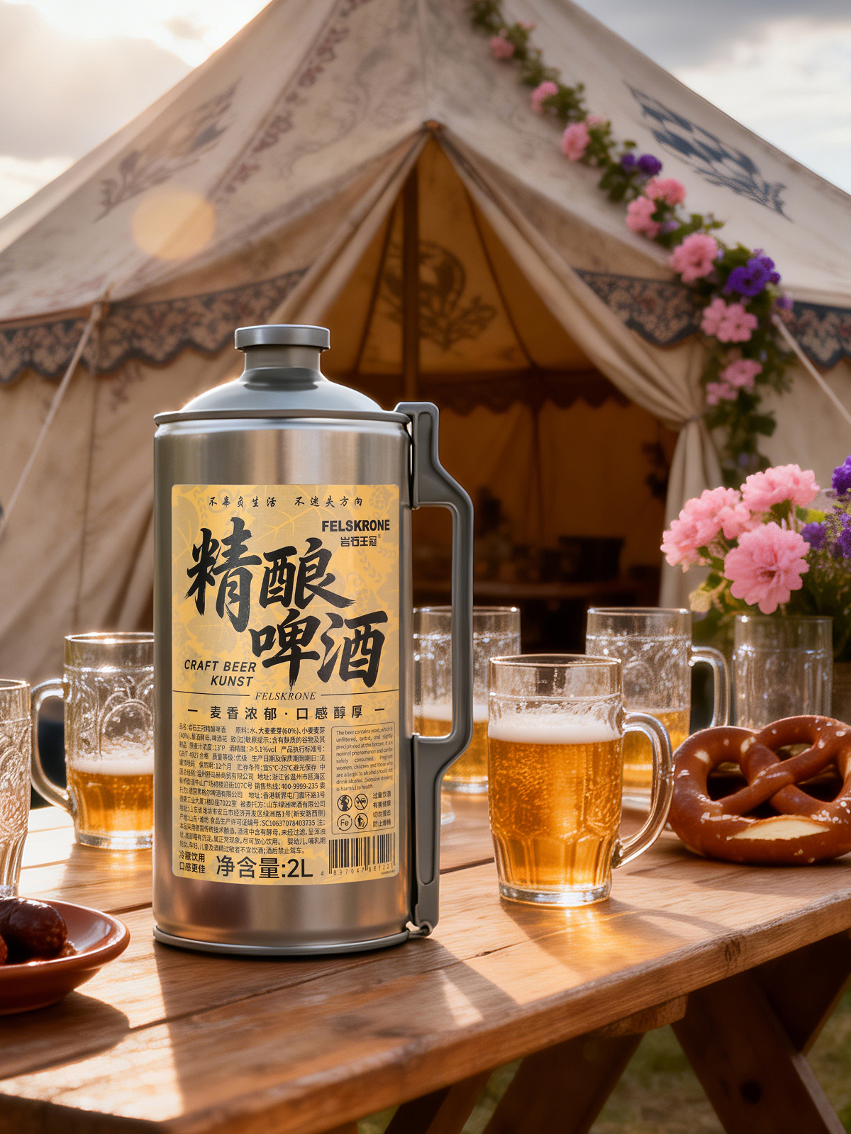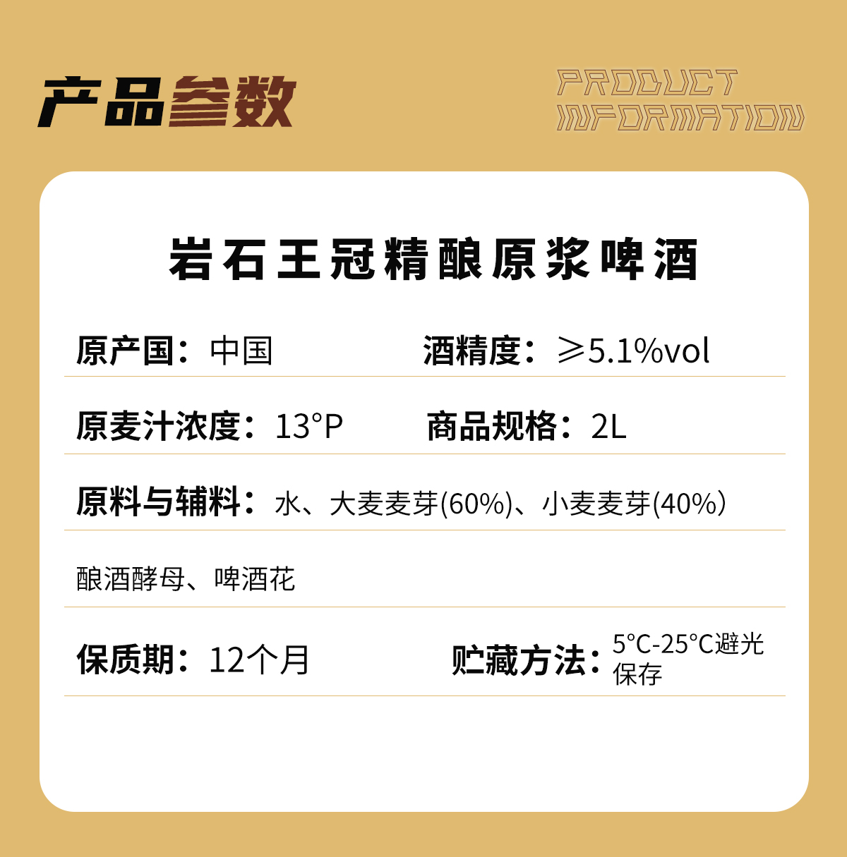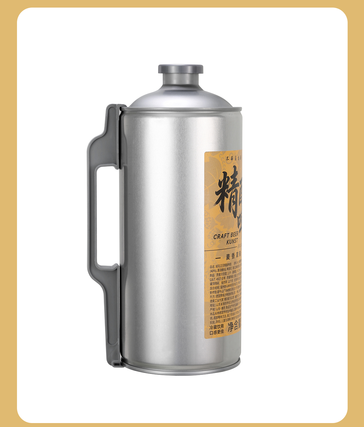 产地:中国 山东 净含量:2L 原料与辅料:水 、大麦麦芽、小麦麦芽、酿酒酵母、啤酒花 酒精度 :≥5.1%vol 原麦汁浓度 :13°P 生产日期:见罐体喷码(年 月 日) 保质期:1年 贮藏条件:5-25°C避光保存
