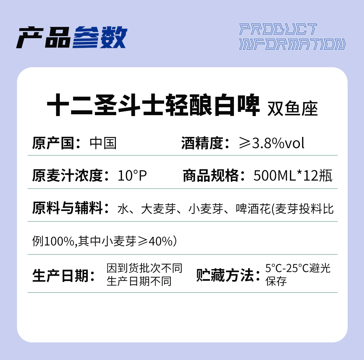 原产国:山东青岛 原料与辅料:水、大麦芽、小麦芽、啤酒花(麦芽投料比例100%,其中小麦芽≥40%) 酒精度:≥3.8%vol 原麦汁浓度:10°P 保质期:12个月 贮藏方法:宜在5℃-25℃干燥、避光贮存
