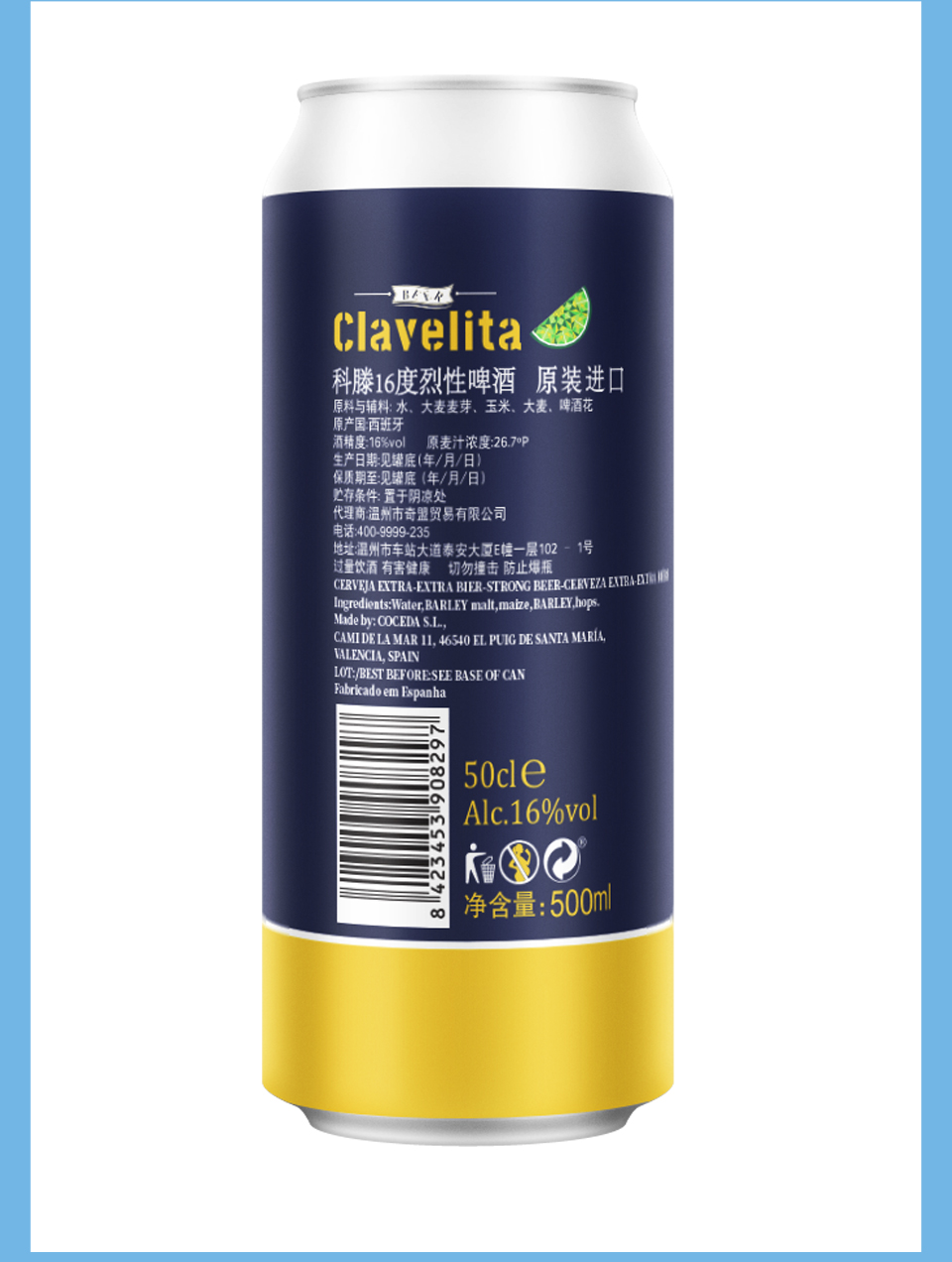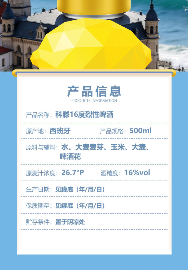 原产国:西班牙 净含量:500ml 系列:黄啤酒 原料与辅料:水、大麦麦芽、玉米、大麦、啤酒花 酒精度:16%vol 麦汁浓度:26.7°P 贮藏条件:置于阴凉处 本品特点:本产品为 烈性啤酒,请君适量饮用.