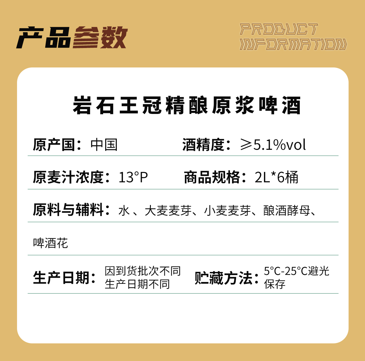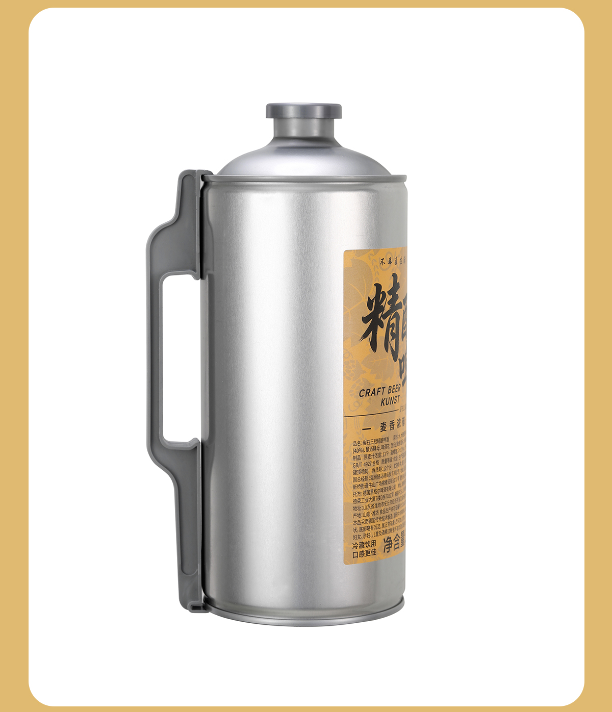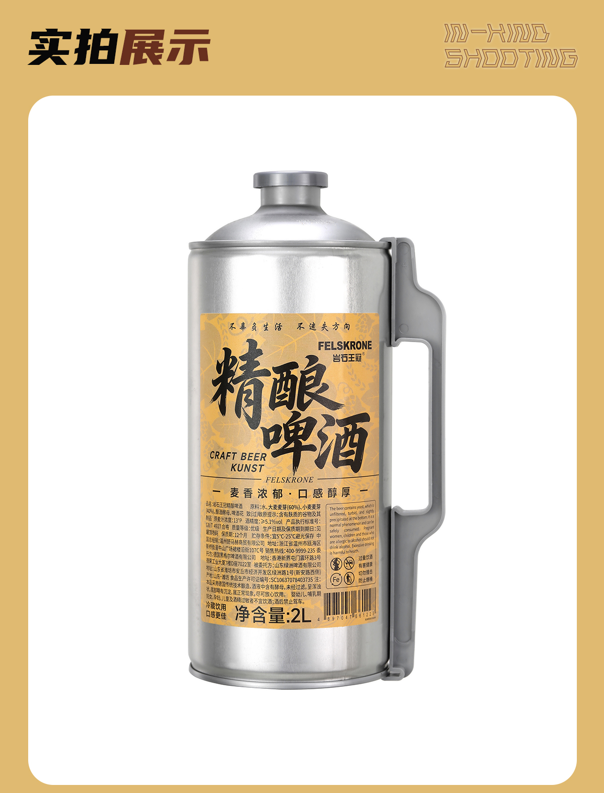产地:中国 山东 净含量:2L 原料与辅料:水 、大麦麦芽、小麦麦芽、酿酒酵母、啤酒花 酒精度 :≥5.1%vol 原麦汁浓度 :13°P 生产日期:见罐体喷码(年 月 日) 保质期:1年 贮藏条件:5-25°C避光保存