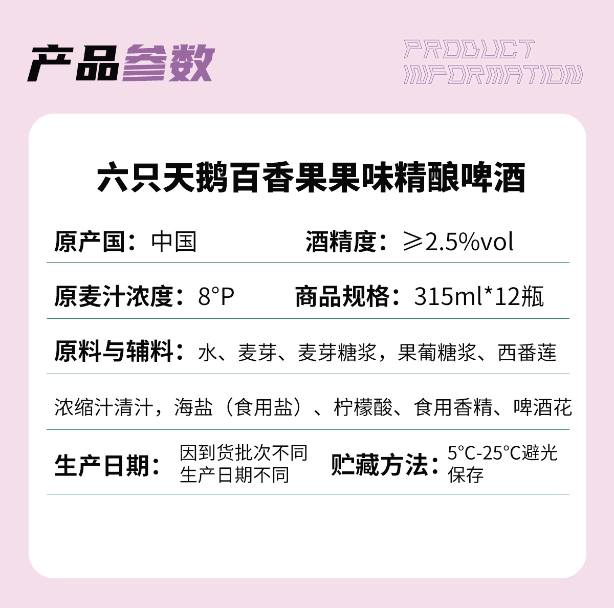 产地:山东省潍坊市 原料与辅料:水、麦芽、麦芽糖浆,果葡糖浆、西番莲浓缩汁清汁,海盐(食用盐)、柠檬酸、食用香精、啤酒花 酒精度:≥2.5%vol 原麦汁浓度:8°P 保质期:12个月 贮藏方法:建议5℃-25℃避光保存