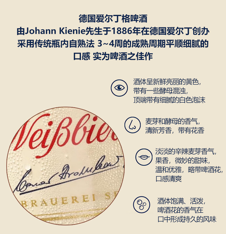 原产国:德国 原料与辅料:水、小麦麦芽、大麦麦芽、啤酒花、酵母 酒精度:5.3%vol 原麦汁浓度:12.6°P 保质期:12个月 贮藏方法:避光,建议低温贮存